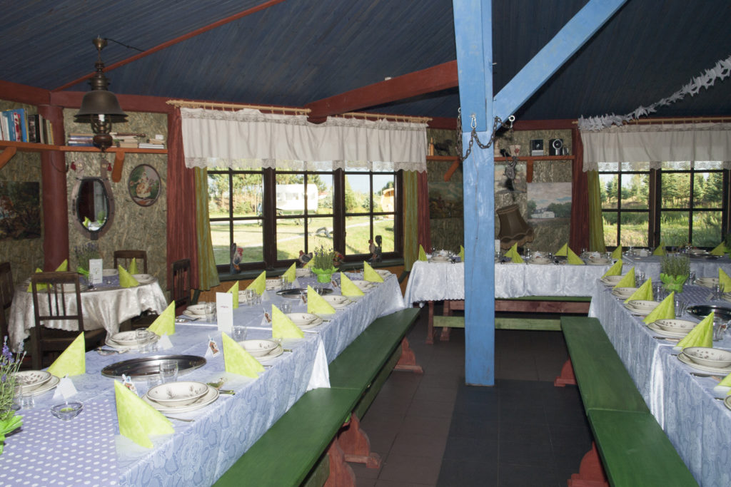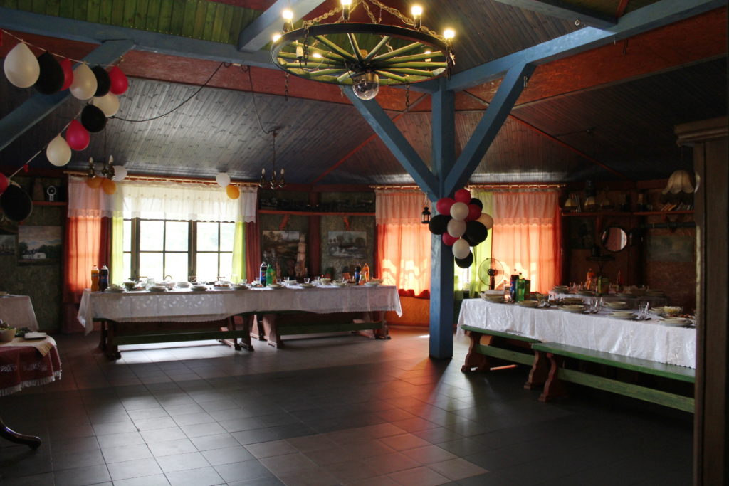 W Budynku Gościnnym oferujemy trzy przestronne i stylizowane świetlice, służące różnego rodzaju spotkaniom rodzinnym, integracyjnym, rozrywkowym, edukacyjnym, konferencyjnym (dobór sali zależnie od charakterystyki spotkania i liczby Gości). W razie potrzeby udostępniamy rzutnik i nagłośnienie. Spotkaniom plenerowym służy także zadaszona obszerna wiata-z miejscem ogniskowym.